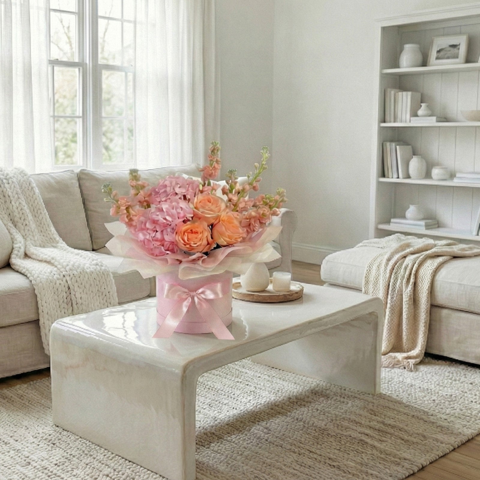 Please note that the Hydrangeas pictured are seasonal blooms, available primarily during summer (December–February). When out of season, they will be replaced with other lush flowers of equal value to maintain the volume and style. Our florists strictly adhere to the soft pastel palette to ensure your gift remains true to the dreamy taste pictured.