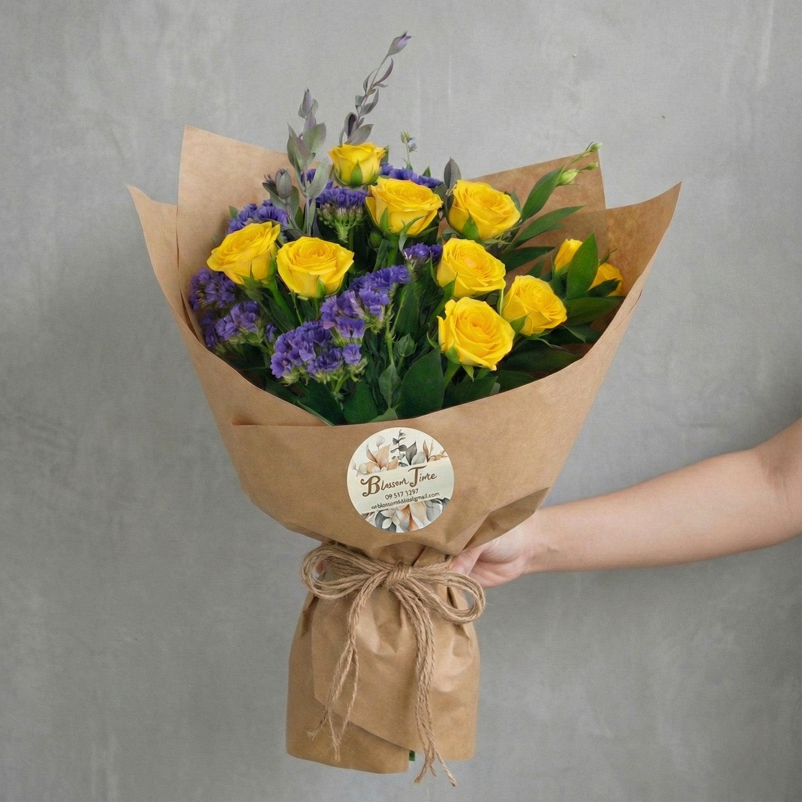 Presenting 'Gold Time' – a radiant bouquet encapsulating warmth and joy. A vibrant mix of sunny yellow roses and contrasting purple/blue blooms are accented with fresh greens to create a happy, energetic vibe. Wrapped in natural kraft paper, it serves as a treasure of vibrant memories.