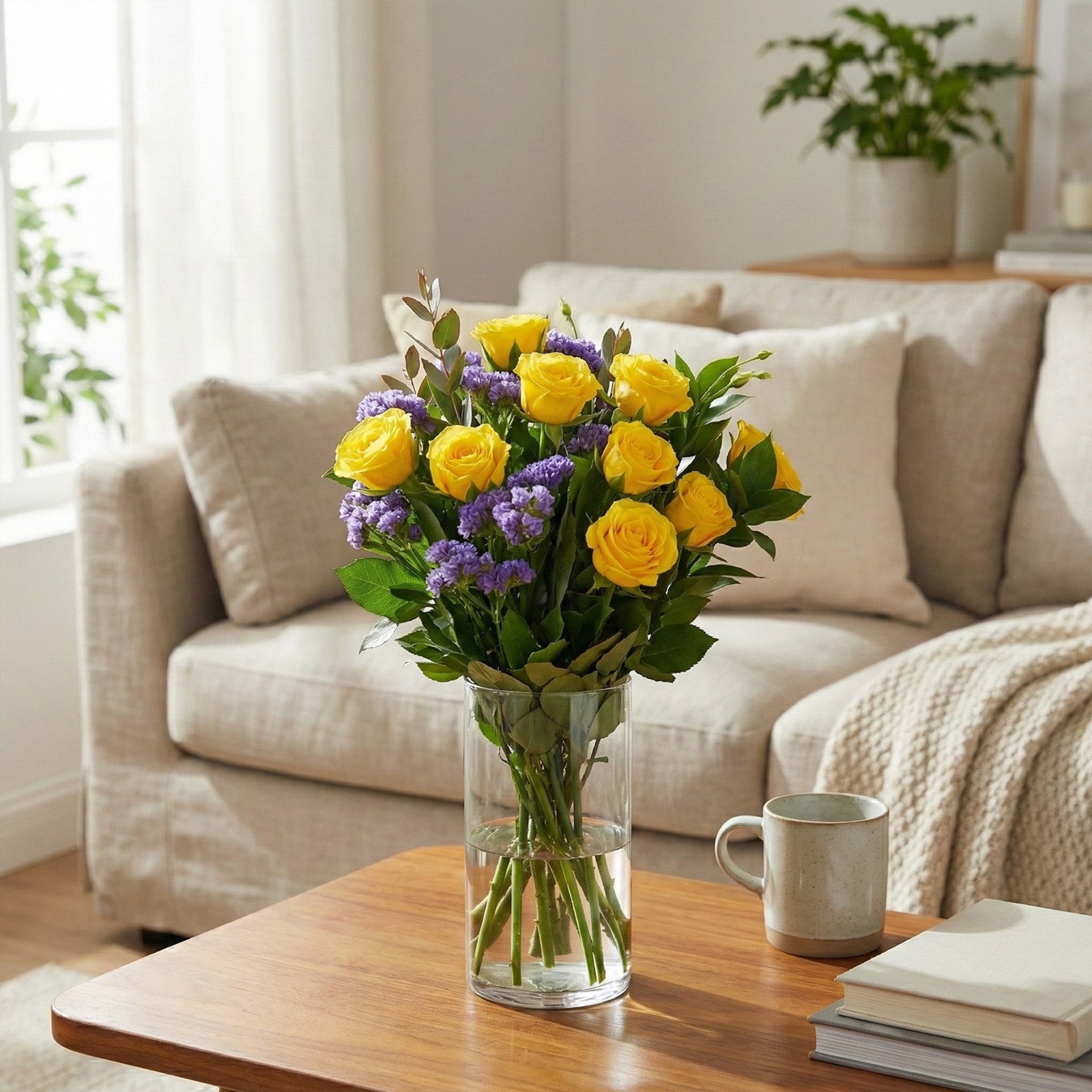 Please note that specific blooms will vary due to seasonal availability. Our florists ensure the arrangement remains true to the lively yellow and blue palette pictured.