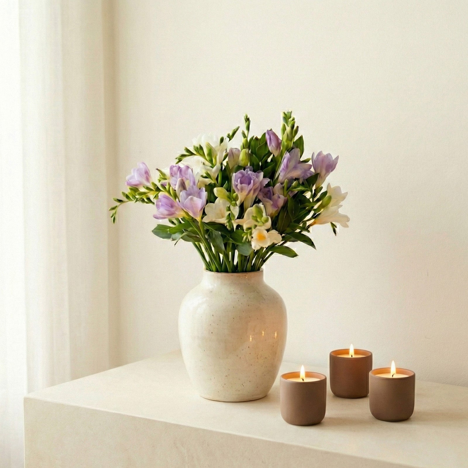 Presenting 'Lovely Freesia' – an enchanting expression of freshness and joy. Exquisite freesias blend with a vibrant array of seasonal blooms and lush fresh greens. Wrapped for an elegant finish, please note details may vary while the joyful mood is kept.