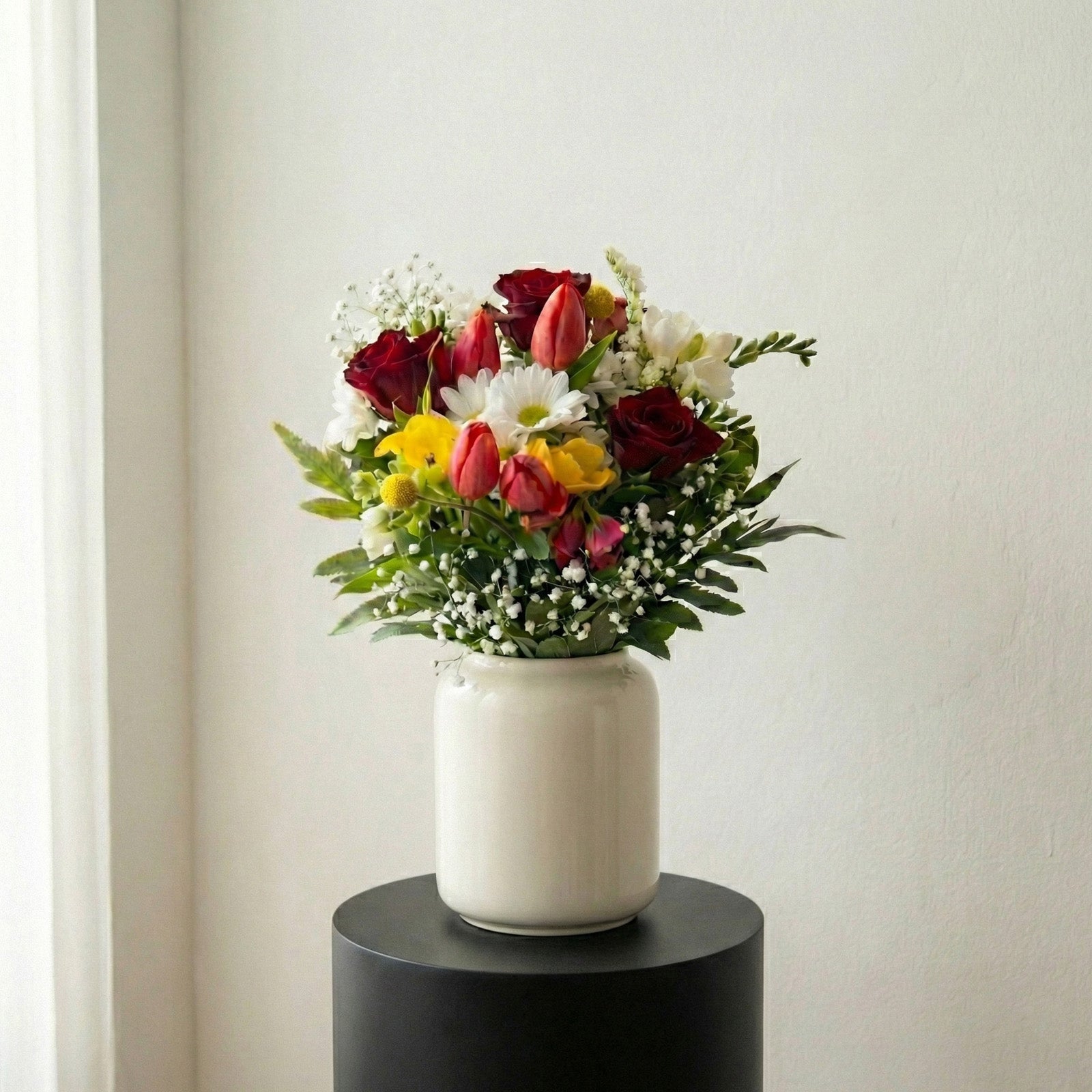 Presenting 'Luscious Bouquet' – a vibrant celebration of colour. Deep red blooms pair with bright whites and sunny yellow accents, wrapped in rustic kraft for a fresh, natural look.