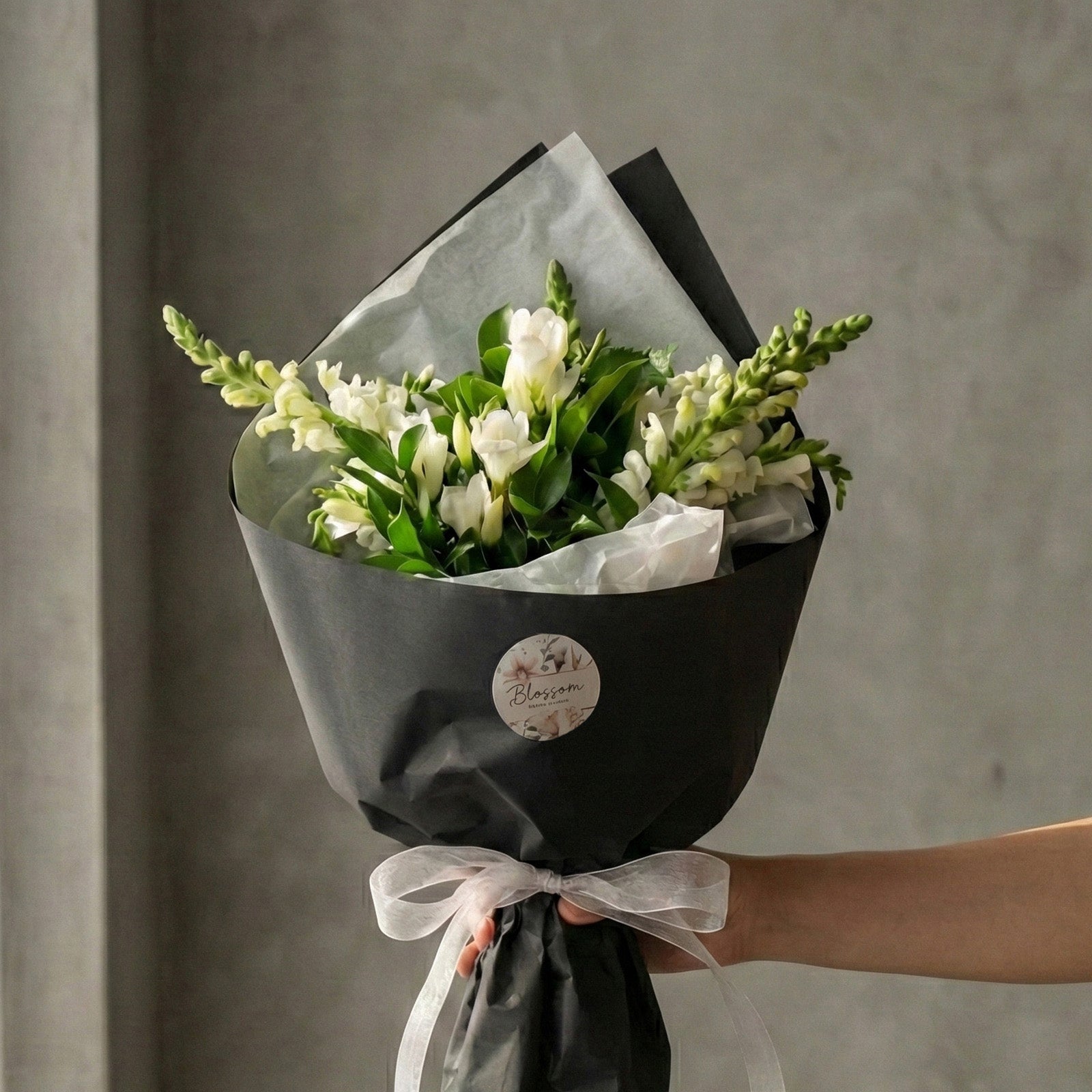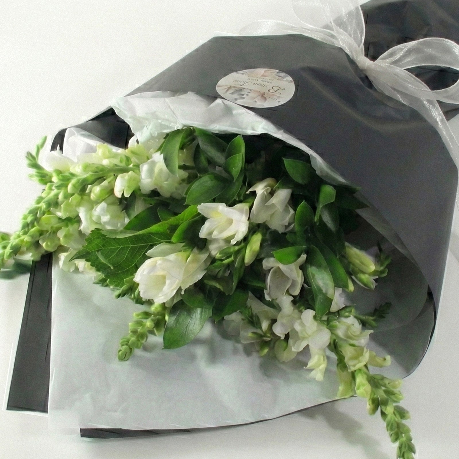Presenting 'Nightingale' – an ode to purity and elegance. A symphony of pristine white blooms mingles with fresh seasonal greens, wrapped in crisp paper for a sophisticated finish. Please note wrapping details may vary while the serene mood is kept.