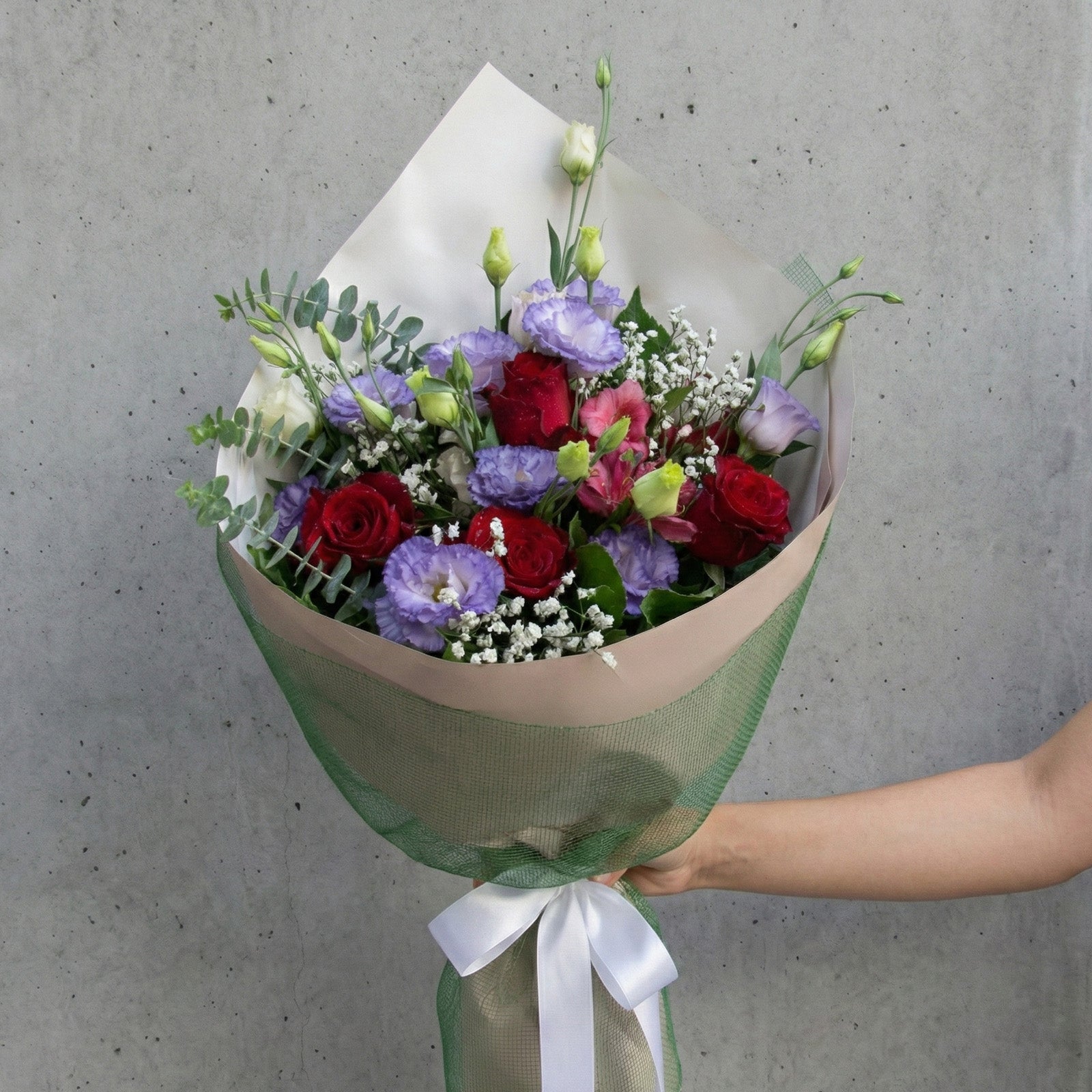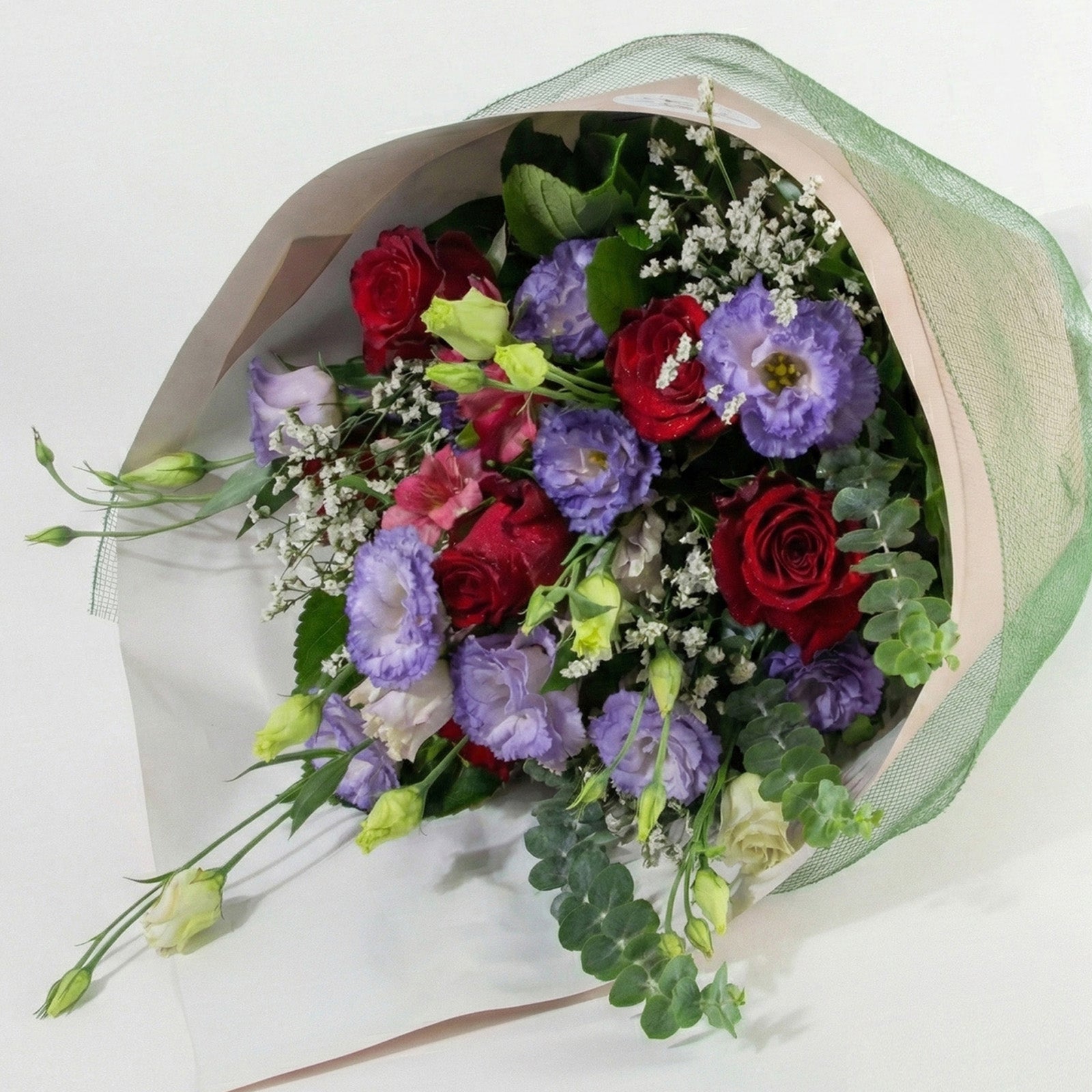 Presenting 'Oh Happy Day 2' – a delightful fusion of bold colour and texture. Rich red roses stand out against soft, ruffled purple blooms and delicate filler flowers, elegantly wrapped in distinctive green mesh.