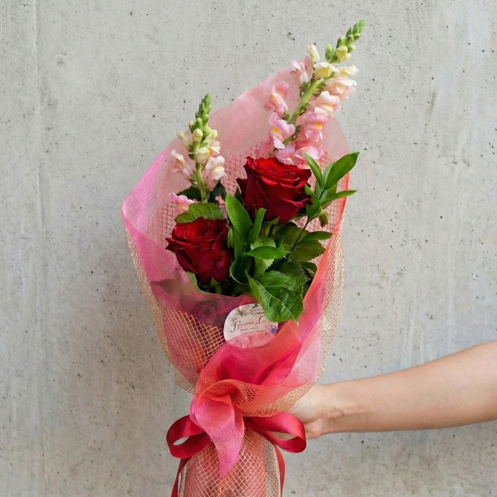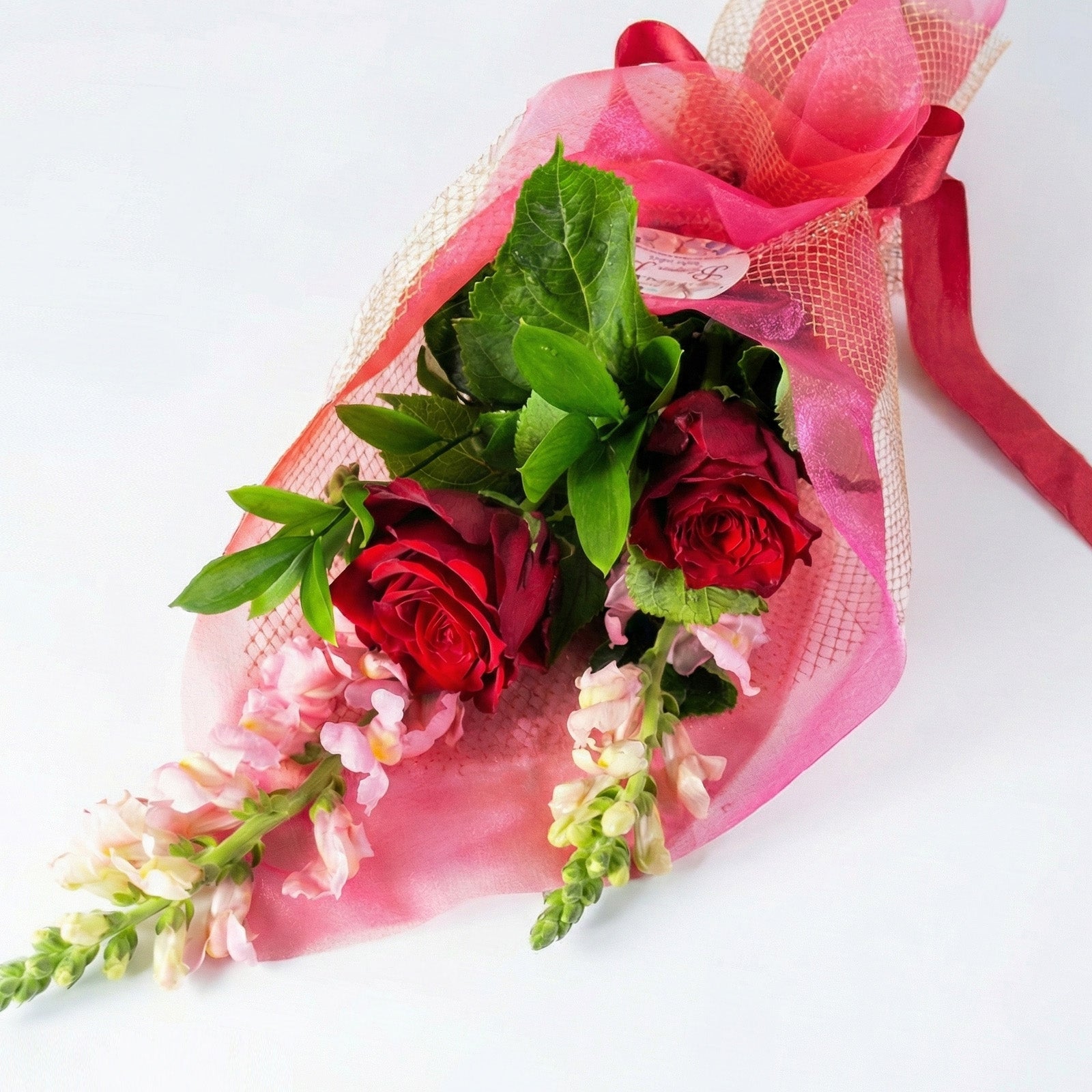 Presenting 'Passion' – a striking expression of love and desire. This elegant vertical arrangement features classic deep red roses paired with tall, soft pink seasonal blooms, creating a perfect balance of intense romance and graceful beauty. Wrapped in textured pink mesh and tied with a satin ribbon, it is a heartfelt gift for your special someone.