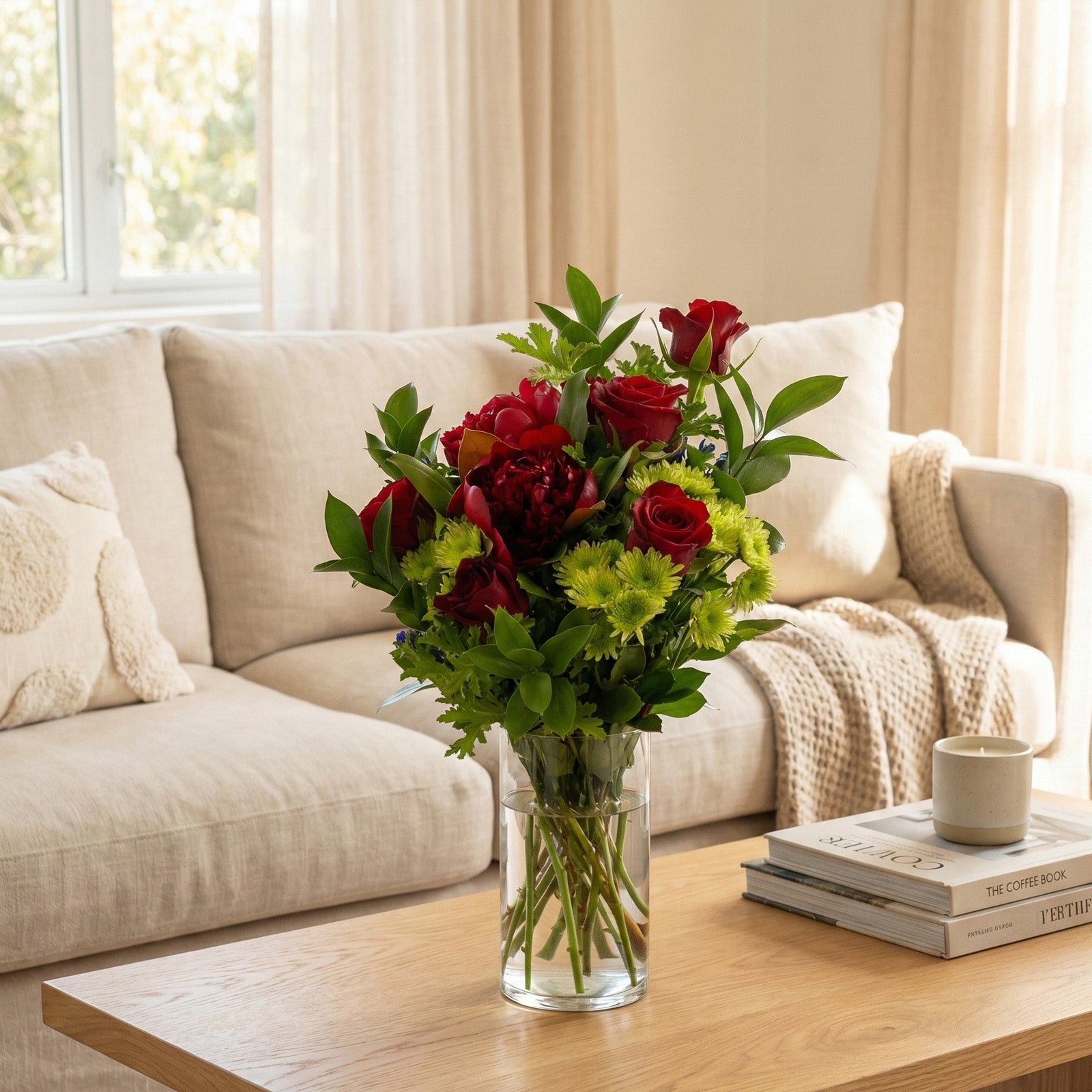 Please note that specific blooms may vary due to seasonal availability. Our florists ensure the arrangement remains true to the vibrant red, pink, and white palette and lush style pictured.