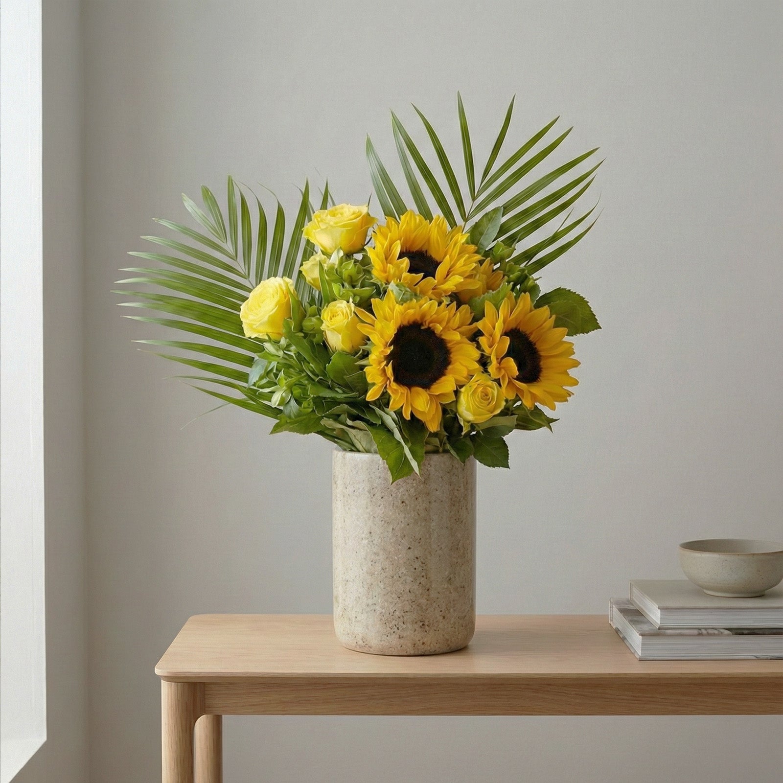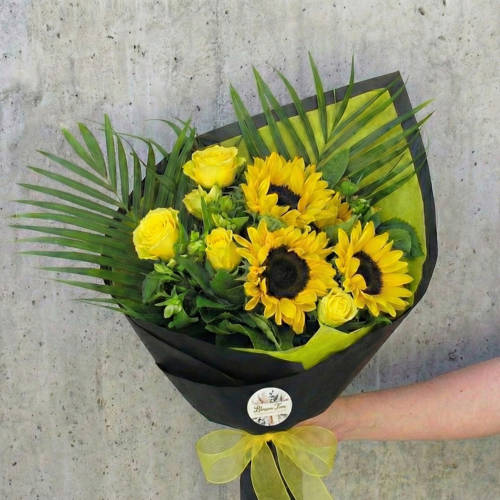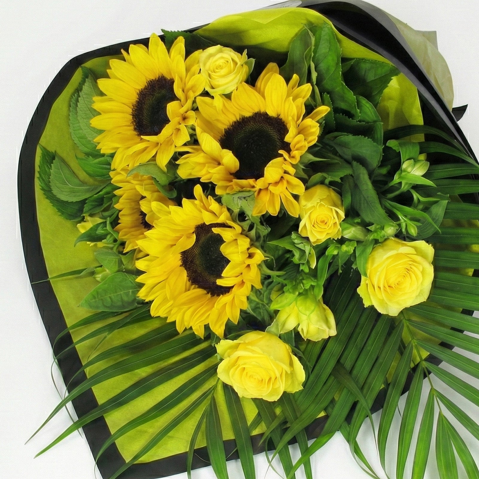 Presenting 'Sunshine' – a visual celebration of joy. Radiant sunflowers pair with a lively array of seasonal yellow blooms and fresh greens. Wrapped for a cheerful finish, please note details may vary while the bright, upbeat mood is kept.