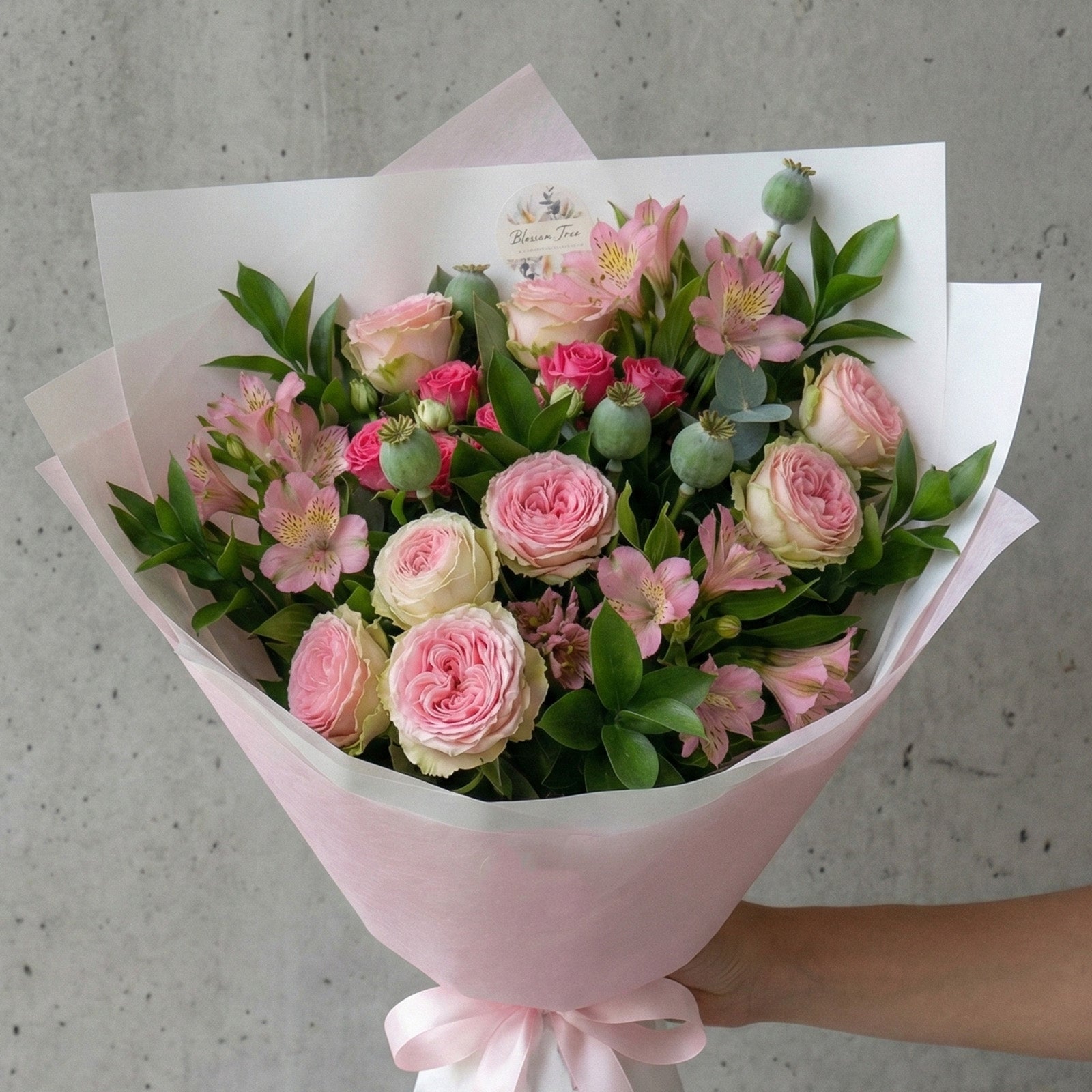 Presenting 'Sweet Whisper' – an exquisite display of luxury. Florist's choice roses blend with a lovely array of mixed pink blooms and lush fresh greens to create an opulent atmosphere. Wrapped for a sophisticated finish, please note details may vary while the charming mood is kept.