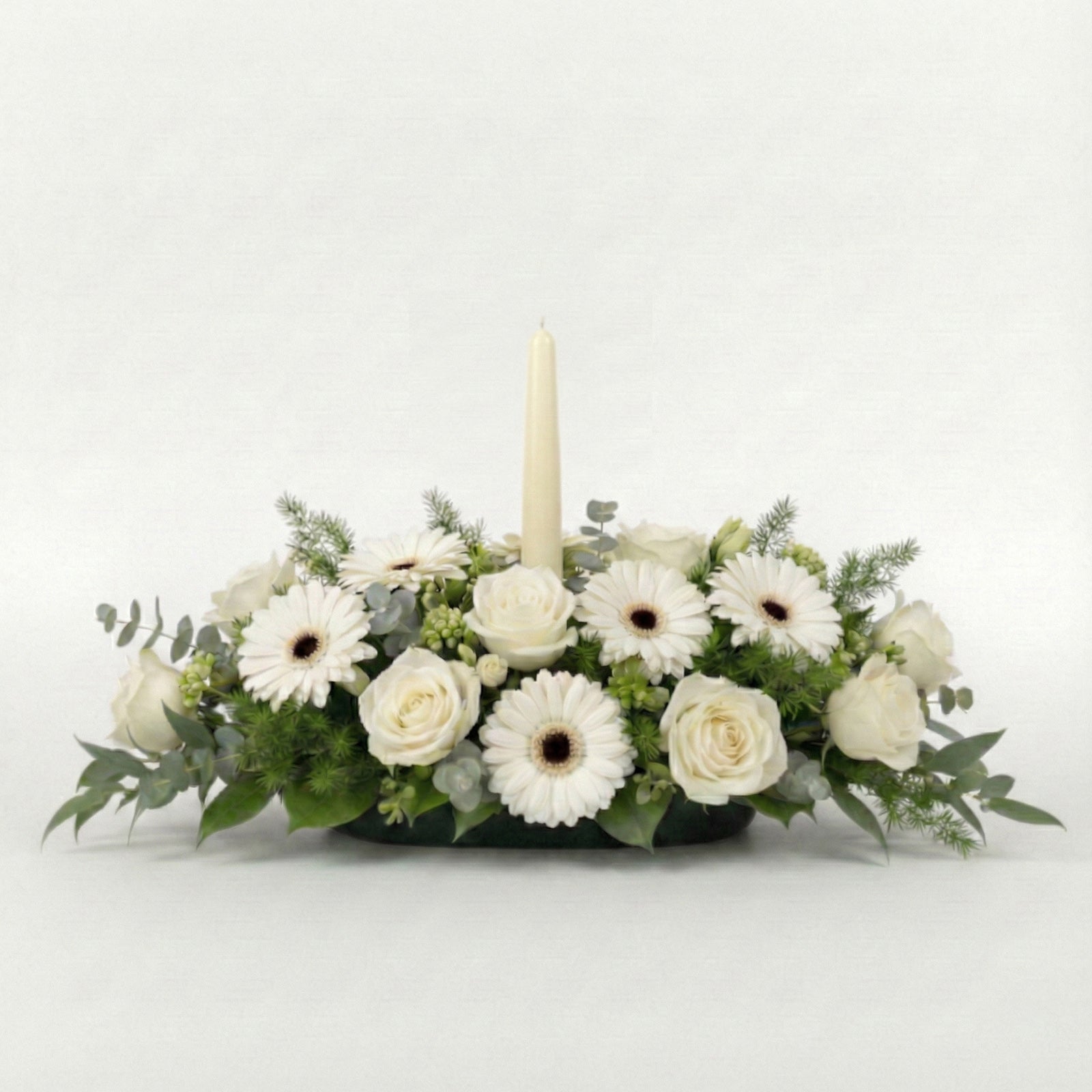Presenting 'Pure Serenity' – a centerpiece of quiet elegance designed to illuminate your gatherings. Pristine white blooms and lush seasonal greens encircle a single cream candle, creating a sophisticated focal point for any dining occasion.