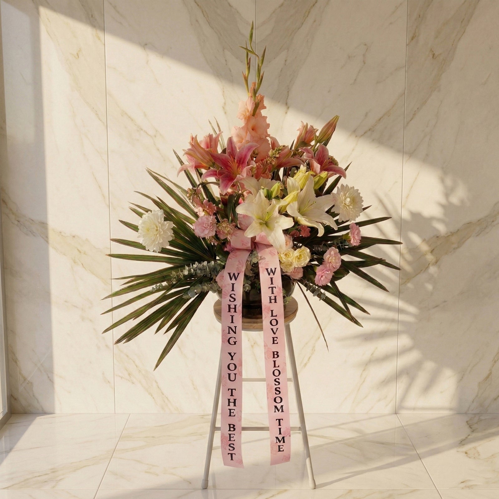Dignified 'Grace' suits sincere sympathy or congratulations. Presented on a provided stand, it is fully customisable—please specify your occasion at checkout. Includes two message ribbons in any language (can opt-out).