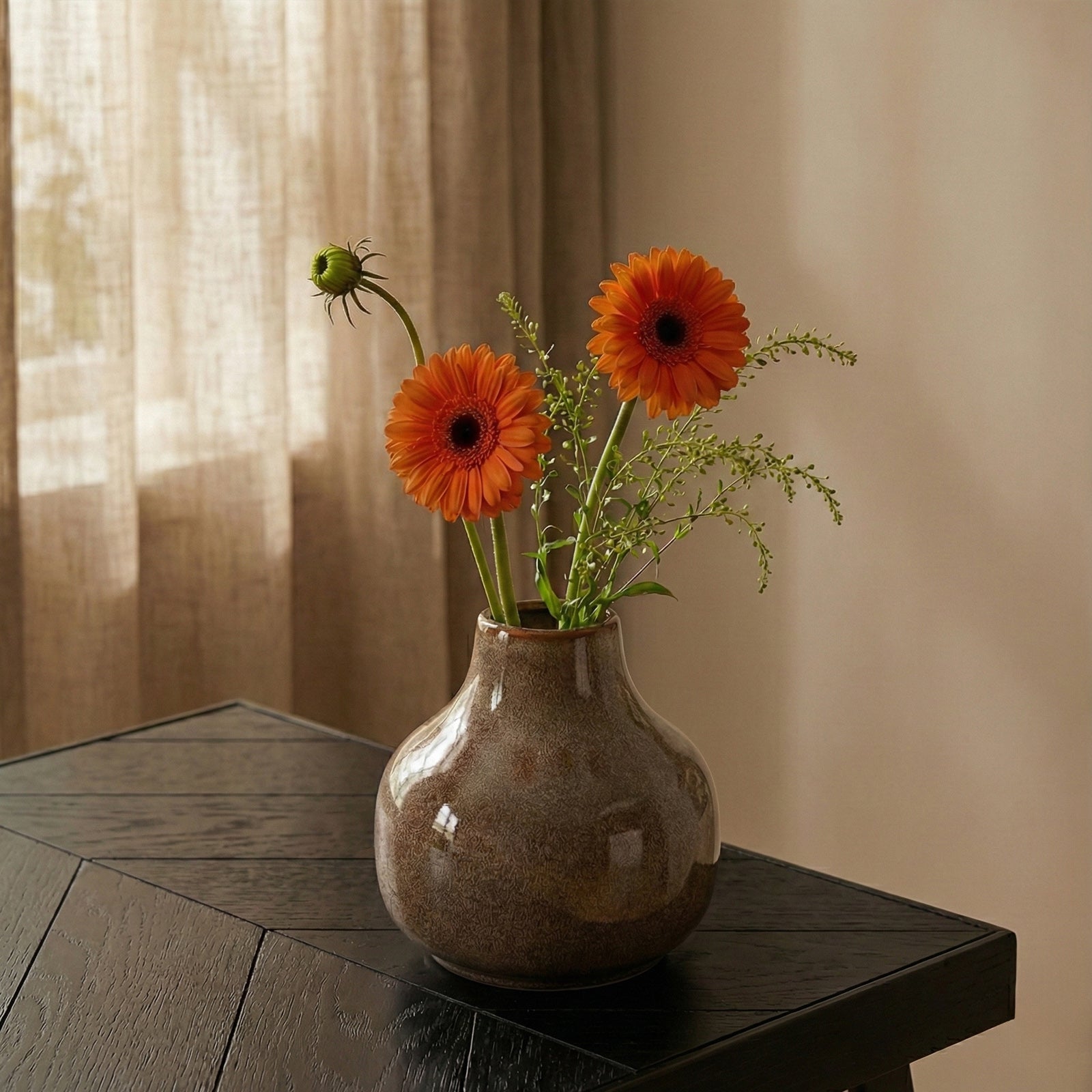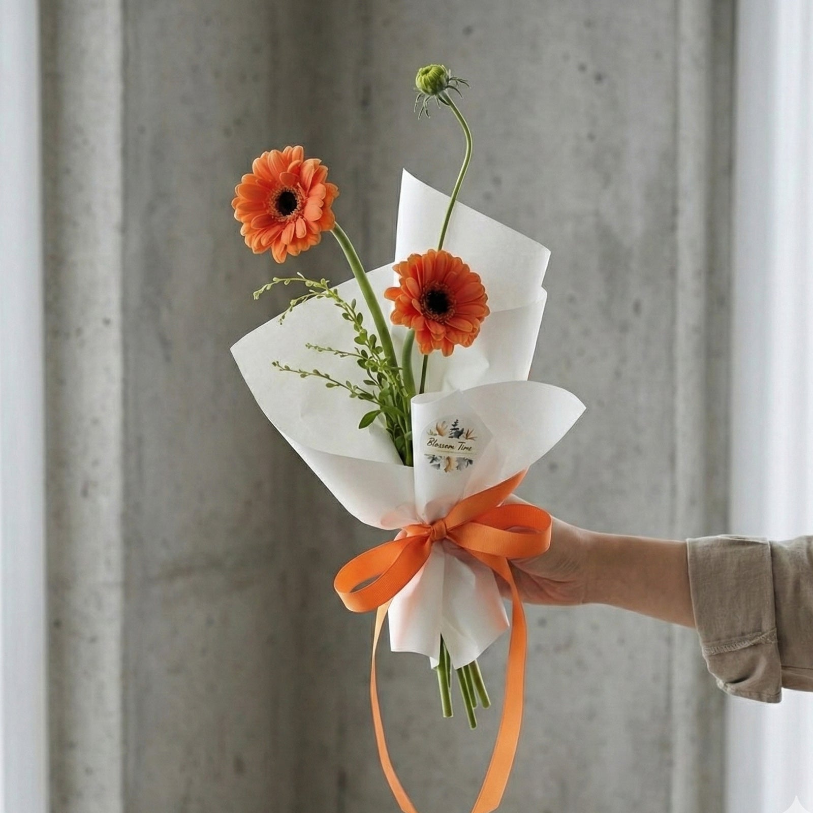 Presenting ‘Tangerine Breeze’ – a refreshing burst of energy featuring vibrant orange Gerberas. Distinguished by their playful, dancing stems and bold colour, these blooms are wrapped in crisp white paper and finished with a matching tangerine ribbon for a look that is effortless and modern.