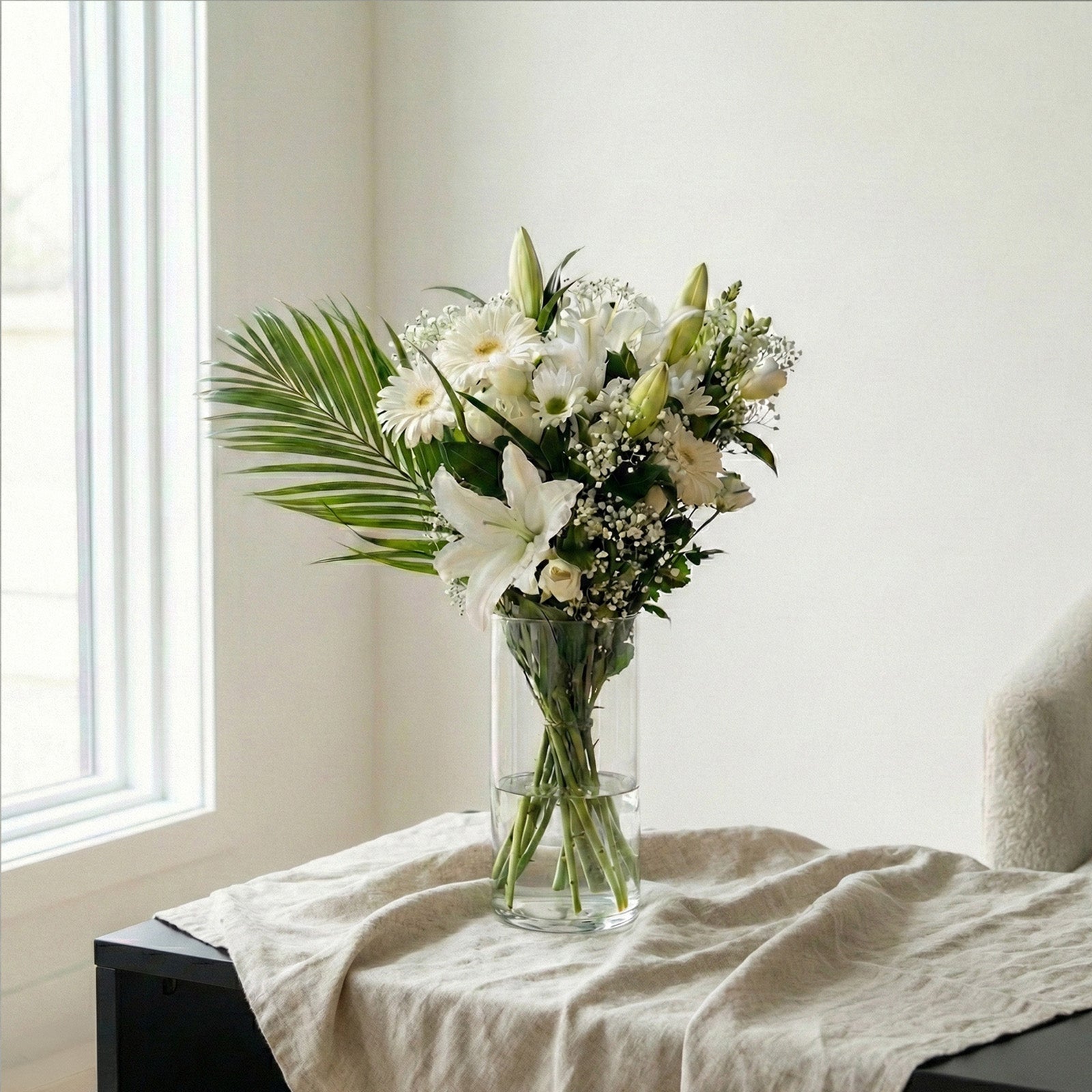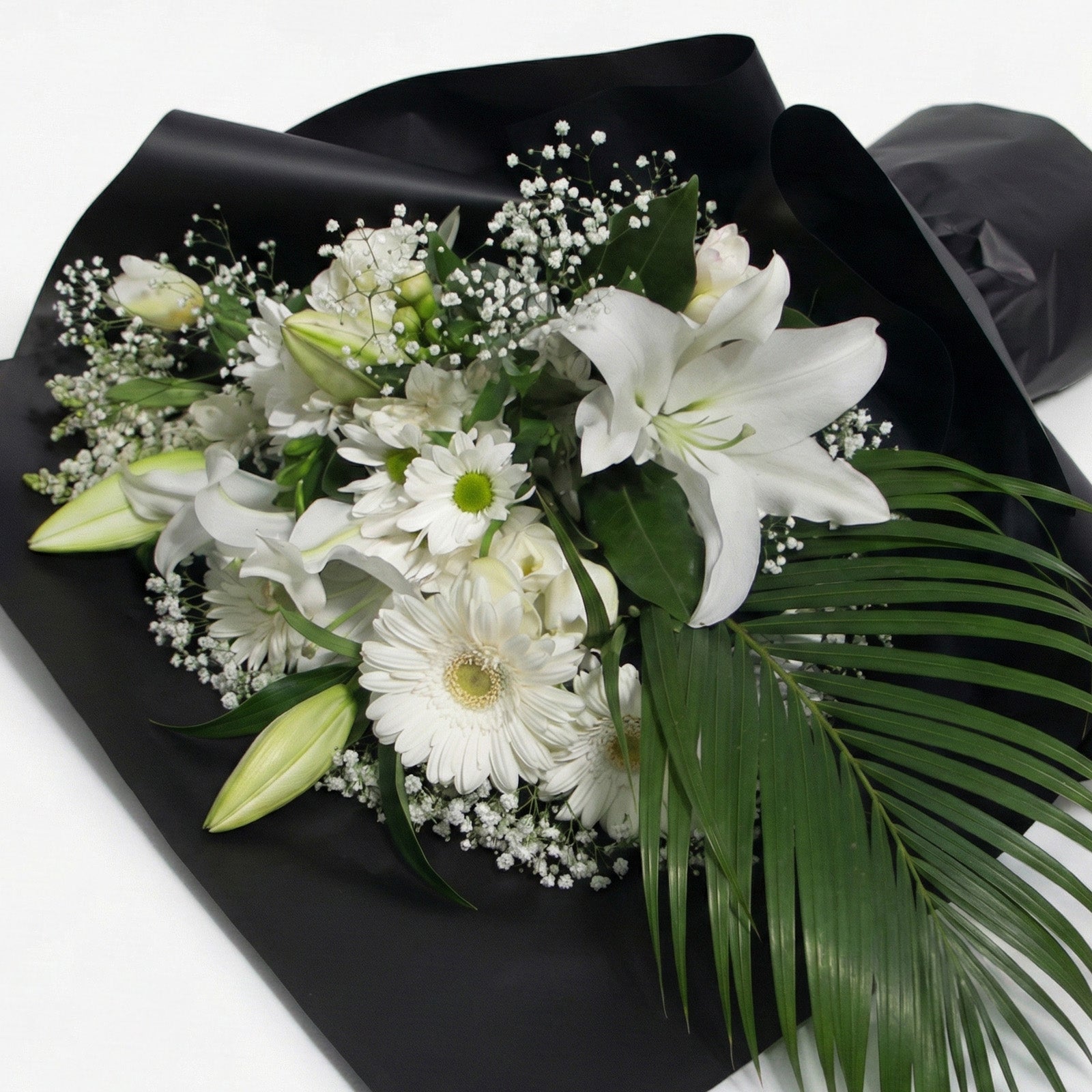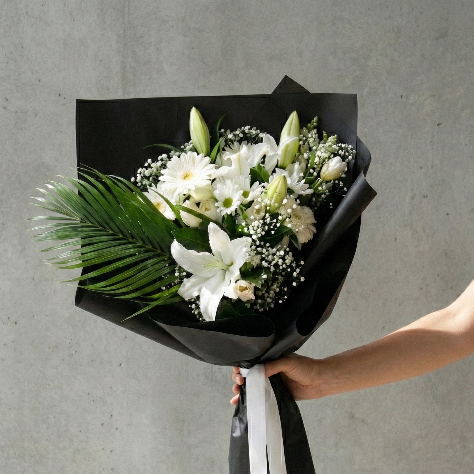 Presenting 'White' – a timeless expression of sophistication. Graceful chrysanthemums and lilies pair with pristine seasonal blooms to create a visual poetry of purity and calm. Wrapped for an elegant finish, please note details may vary while the serene mood is kept.