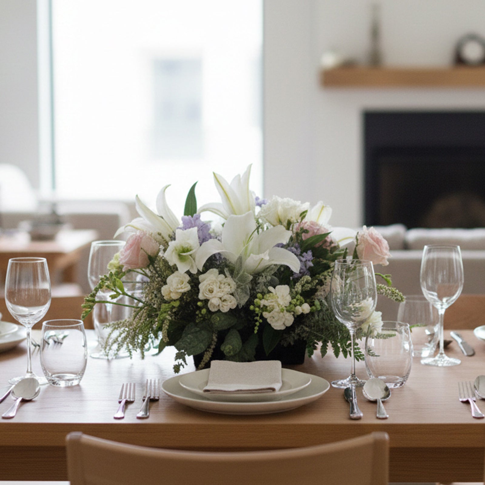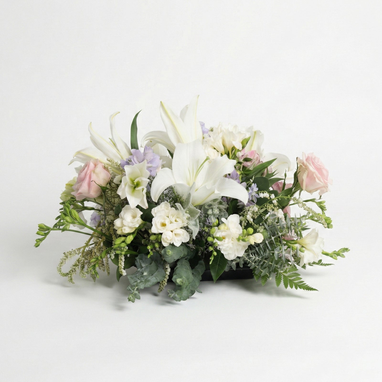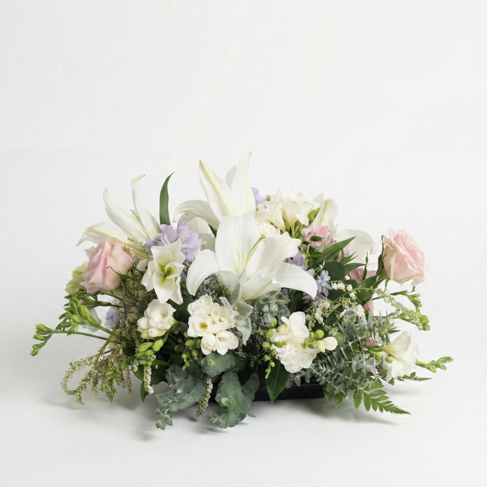 Presenting 'White Harmony' – a serene display of natural elegance. Majestic white lilies take centre stage, harmonising with soft pink blooms and delicate purple accents. Artfully arranged amongst lush textured foliage, this garden-style arrangement brings a sense of peace to any space.